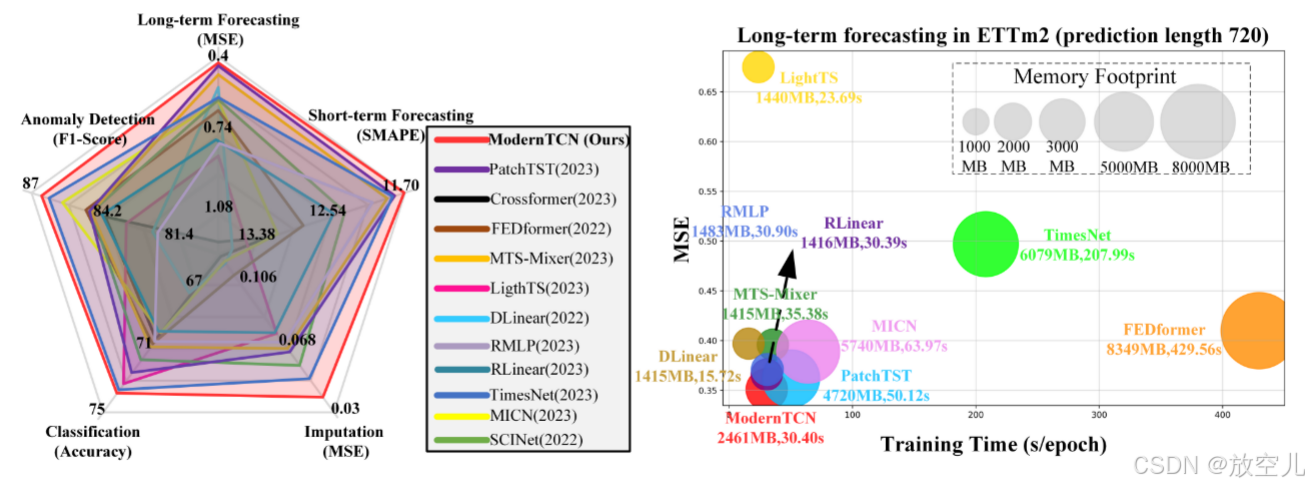 ModernTCN在分类任务中每个训练周期平均节省55.1%的时间(3.19秒 VS 7.10秒),在异常检测任务中平均节省57.3%的时间(132.65秒 VS 310.62秒)。