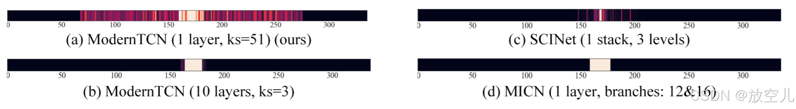 注:SCINet和MICN是两个基于TCN的预测模型,它们的感受野都很小。作者发现ModernTCN中采用大的卷积核所对应的感受野要大很多。