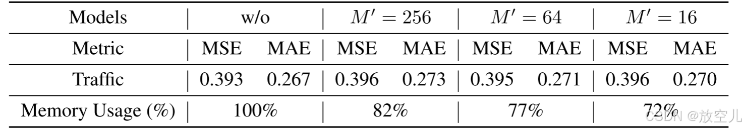注:在本文中,设计了一种瓶颈结构来实现这一目标,这是一种简单直接的方法。具体来说,在输入ConvFFN1和ConvFFN2之前,通过一个投影层将变量数量投影到M',其中M'比M小很多。然后在ConvFFN1和ConvFFN2处理后,再用另一个投影层将变量数量恢复到M。用不同的M'进行实验来验证这个解决方案。如表1所示,作者的方法可以显著减少内存使用,且性能仅有少许下降。这个结果证明了交通数据集中的862个变量之间存在冗余。因此,可以根据这些变量之间的依赖关系,学习到它们的低秩近似。这种低秩近似有助于在不过多降低性能的情况下减少内存使用。