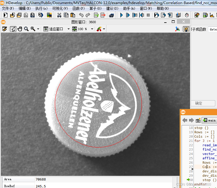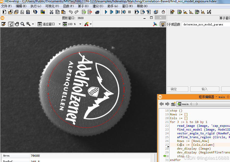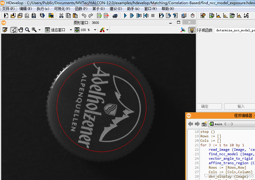 参考Halcon样例位于HDevelop示例->方法->模板匹配(基于形状)->pm_multiple_models.hdev。:由于该模板是基于灰度值进行匹配,导致使用时要求图像的光照稳定有较高的要求,在实际中使用的不多。*特别需要注意使用create_ncc_model创建模板后,模板区域角度将自动旋转到0度。:可以解决光照不均,不足,光照变化的场景,以及焦点变化的场景(图像模糊)的模板匹配。