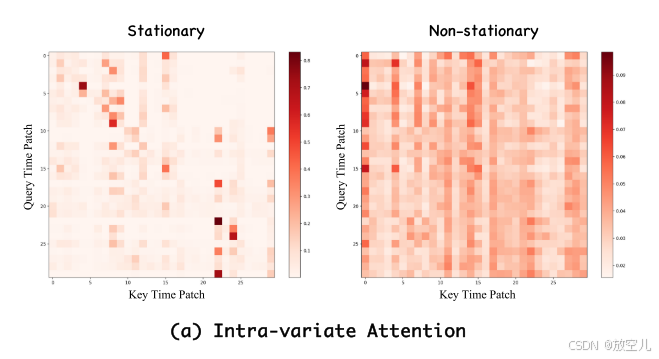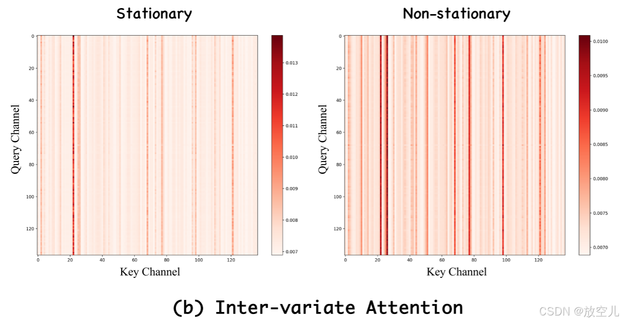去除非平稳性后,模型的注意力集中在少数几个变量间的关系上。而保留非平稳性可以让模型捕捉到更多样和丰富的关系。