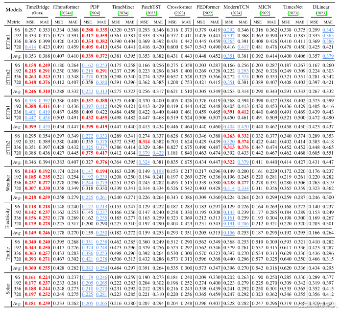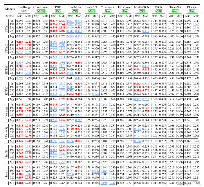 长期预测结果表格1 更侧重于展示原始论文中报告的结果,而 表格2 则展示了通过超参数搜索得到的结果,可能包括一些原始论文中未涉及的模型或设置。