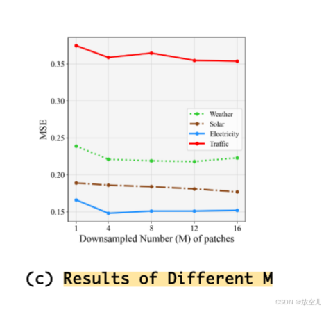 不同下采样率(即减少片段数量)对模型预测性能的影响。对于通道更多、协整性更强的数据集(如太阳能和交通),增加下采样片段数量最初可以改善预测,然而,过多的下采样会增加计算成本,并对通道较少的数据集(如天气)产生负面影响。