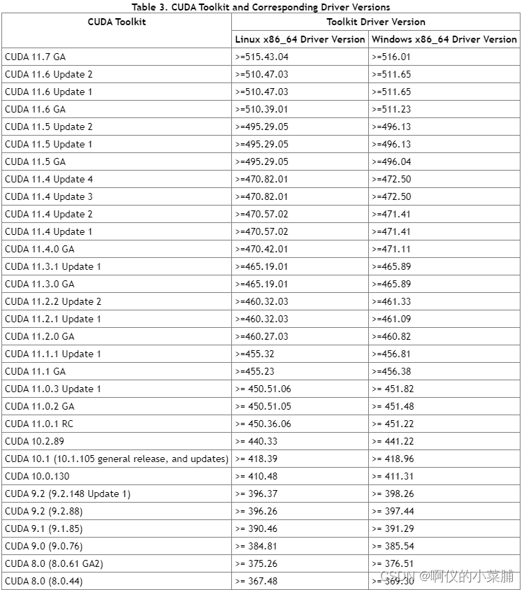 需要注意的是,不一定需要使得 runtime 版本的 CUDA与驱动版的 CUDA 相一致。从第一张截图我们可以看到,圈出来的 CUDA Version :11.7 的左边有一个 Driver Version:516.01,这个才是一个分水岭。首先我们到网上找 CUDA Toolkit 与 Driver Version 的对应关系,官网链接如下 :Release Notes :: CUDA Toolkit Documentation 。从官网上截图如下所示,列表上没有自己本机所对应的 Driver Version 的小伙伴就进官网自己查一下。