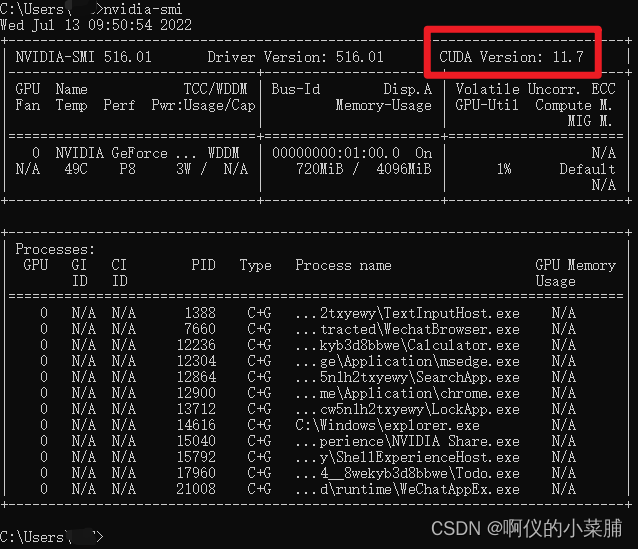 可以看到,我的 Driver Version 为 516.01,可以支持的最高版本是 CUDA Version 11.7,但是由于 Pytorch 官网没有来得及推出支持 CUDA 11.7 的 Pytorch ,故我只能下载 CUDA 11.6 的版本去迎合 Pytorch 的较低版本。至此,关于 CUDA runtime 版本与驱动版本的问题解决。