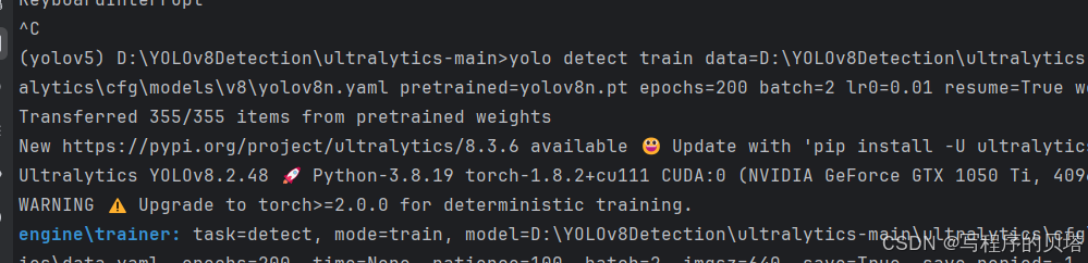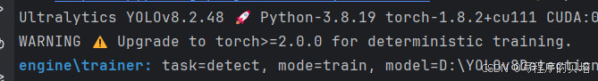 第2个WARNING是WARNING ⚠️ Upgrade to torch>=2.0.0 for deterministic training.
