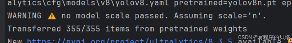 补充一下解决方案,这里的问题是,cfg文件夹下v8的yaml文件中,没有叫yolov8n.yaml的文件,所以我们只需要复制一份yolov8.yaml 文件,给它重命名为yolov8n.yaml就不会报这个WARNING