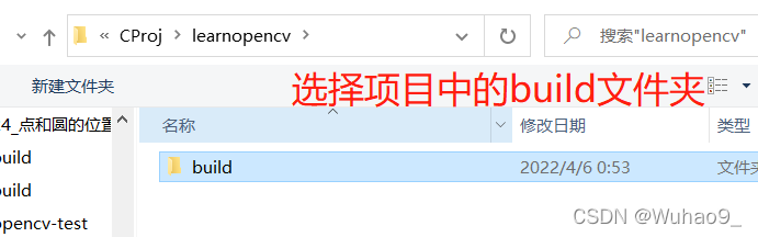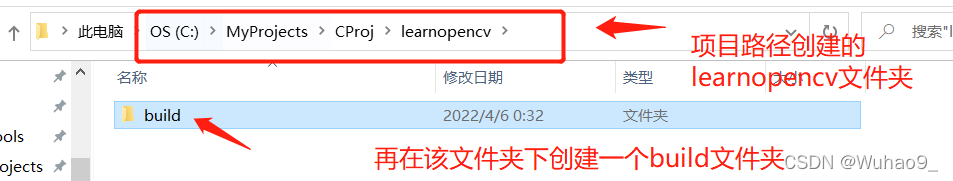 如上图步骤,创建完build文件夹后,再在lenrnioencv文件夹下用vs code打开,并创建一个CMakeLists.txt(注意区分大小写!)和main.cpp。如下图所示: