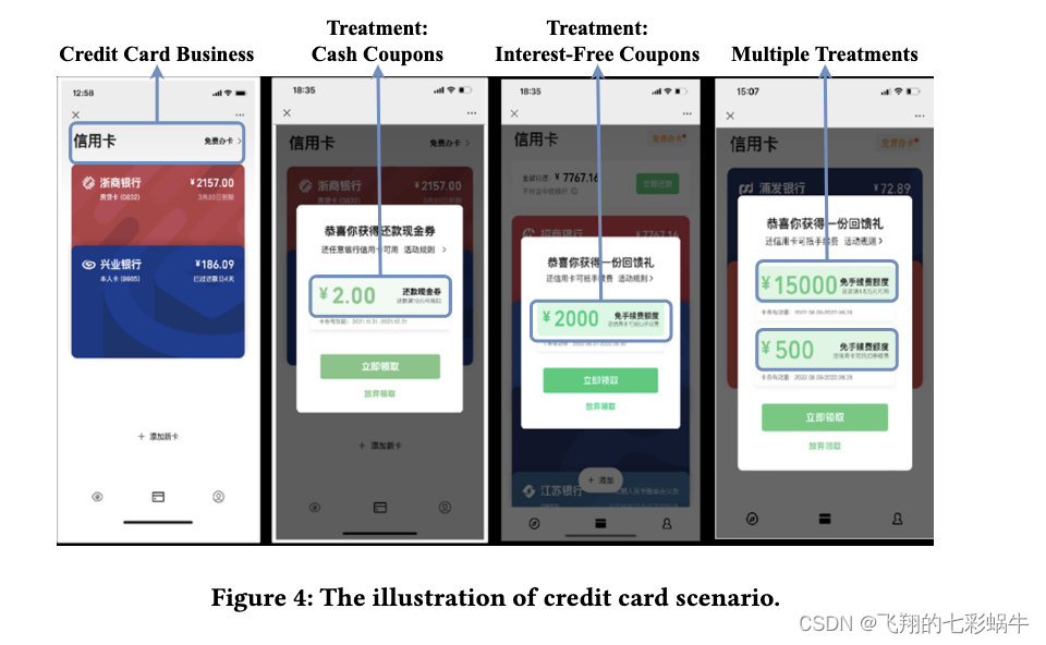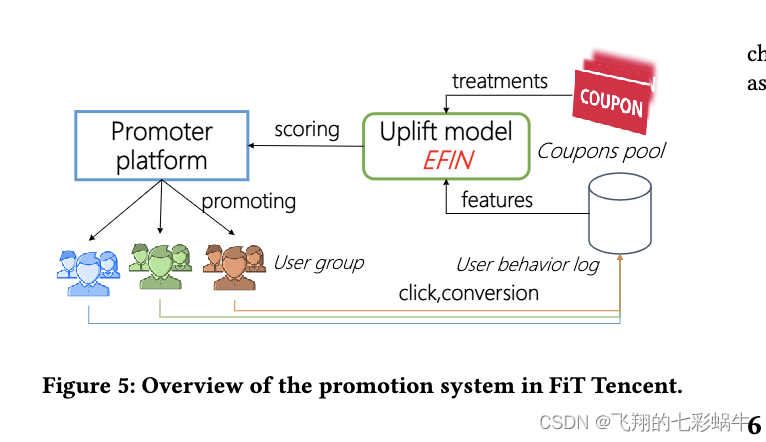 该场景如图4所示。在这种情况下,营销需要为不同的客户群体发起不同的活动,以激励更多的用户在这个平台上支付信用卡账单。一旦用户倾向于在平台上支付信用卡账单,治疗就会提升到一些用户组。在这种情况下,根据账单金额的限制,有各种类型的优惠券。具体来说,有一些小的提名优惠券,不需要最少的要求,一些更高的提名优惠券需要最少的金额,因此在这种情况下的最终处理数设置为7。高级架构如图5所示。用户行为从数据源(一些存储集群)中提取,使用Apache Spark5生成特征,处理候选是具有各种量的优惠券。提升模型将对每个优惠券上的每个用户的提升值进行评分。最后,启动子平台将进一步向具有一定资源约束的用户组提供优惠券。请注意,我们的工作侧重于如何提高提升模型的性能,这是整个系统的关键组成部分。