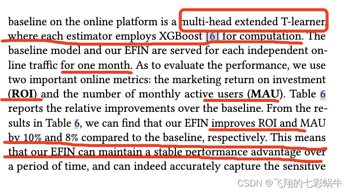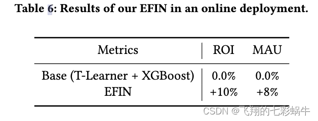 5.4.2 在线实验结果。为了进行在线 A/B 实验,我们划分了两组相互影响的在线流量,涉及数亿用户。现有的在线平台上的基线是一个多头扩展 T-learner,其中每个估计器使用 XGBoost [6] 进行计算。基线模型和我们的 EFIN 为一个月的每个单独的在线流量提供服务。为了评估性能,我们使用了两个重要的在线指标:投资的营销回报 (ROI) 和每月活跃用户 (MAU) 的数量。表 6 报告了对基线的相对改进。从表 6 中的结果来看,我们可以发现与基线相比,我们的 EFIN 将 ROI 和 MAU 分别提高了 10% 和 8%。这意味着我们的 EFIN 在一段时间内可以保持稳定的性能优势,并且确实可以准确地捕获敏感。