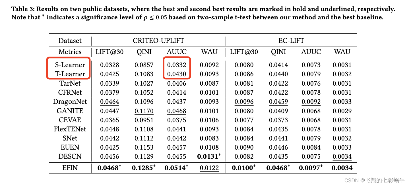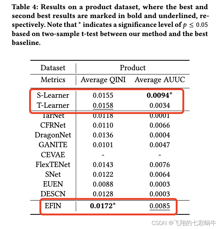 为了评估我们的EFIN的有效性,我们在基于神经网络的隆起建模中选择了一组最具代表性的方法,包括S-Learner[17]、T-Learner[17]、TarNet[30]、CFRNet[30]、DragonNet[31]、GANITE[35]、CEVAE[21]、SNet[8]、FlexTENet[9]、EUEN[16]和DESCN[39]。