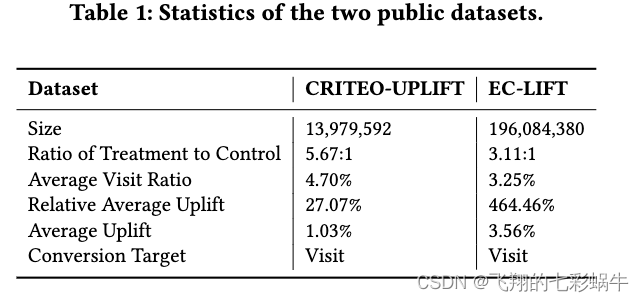 5.1.1 数据集。继之前的工作[16]的设置之后,我们在两个公共数据集上进行了实验,包括CRITEOUPLIFT[11]和EC-LIFT[16]。CRITEO-UPLIFT 是一个由 Criteo AI Labs 开源的数据集,用于大规模广告场景中的提升建模,其中包括近 1400 万个实例、12 个连续特征和二进制处理。EC-LIFT 是大规模广告场景中不同品牌的提升建模数据集,由 Alimama 开源。该数据集包含数十亿个实例、25 个离散特征和九个多值特征以及二进制处理。由于数据规模过大,为了便于训练,我们从原始 EC-LIFT 数据集中提取了大约 40% 的实例作为实验数据集。两个公共数据集的统计数据如图所示表1。我们随机拆分两个数据集进行训练和测试,比例为8/2。注意,由于用户特征和上下文特征的建模是一致的,不需要特别的区别,我们在实验中使用上述数据集中的所有特征。此外,在先前工作的设置之后,我们将处理视为二元特征。为了全面评估我们的 EFIN,我们还包括从两周的在线优惠券营销场景中收集的产品数据集,用于信用卡支付。该产品数据集总共使用了 200 多个特征,涉及 200 万个用户,有 200 万个实例,其中 90% 用于训练集,其余用于测试集。特别是,产品数据集中包含了七个处理选项,而不是公共数据集中的二进制处理。