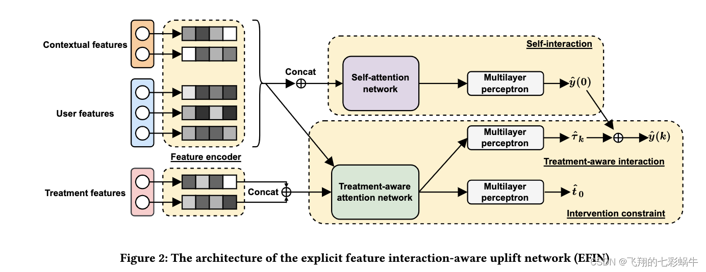 为了解决上述两个挑战,在本文中,我们提出了一个显式特征交互感知提升网络(EFIN)。具体来说,我们的 EFIN 包含四个模块:1)特征编码器模块旨在编码包含用户特征、上下文特征和处理特征的营销实例; 2)自交互模块负责控制组中用户的响应。它使用自注意力网络来建模除了处理特征之外,所有特征之间的交互以捕获与自然响应相关的特征子集(即不接受任何处理); 3) 治疗感知交互模块负责治疗组中用户的响应。它使用处理感知注意网络对处理特征与其他特征之间的相互作用进行建模,以识别对不同处理敏感的特征子集,并准确捕获用户对不同处理响应的变化; 4) 干预约束模块用于平衡处理组和对照组之间用户的ITE分布,以便我们的EFIN在不同的场景中更加健壮。该模块是必要的,因为在真正的营销场景中,治疗分配通常是非随机的,将导致对照组和治疗组之间的用户分布差异。最后,我们进行了广泛的离线和在线评估,结果验证了我们的 EFIN 的有效性。