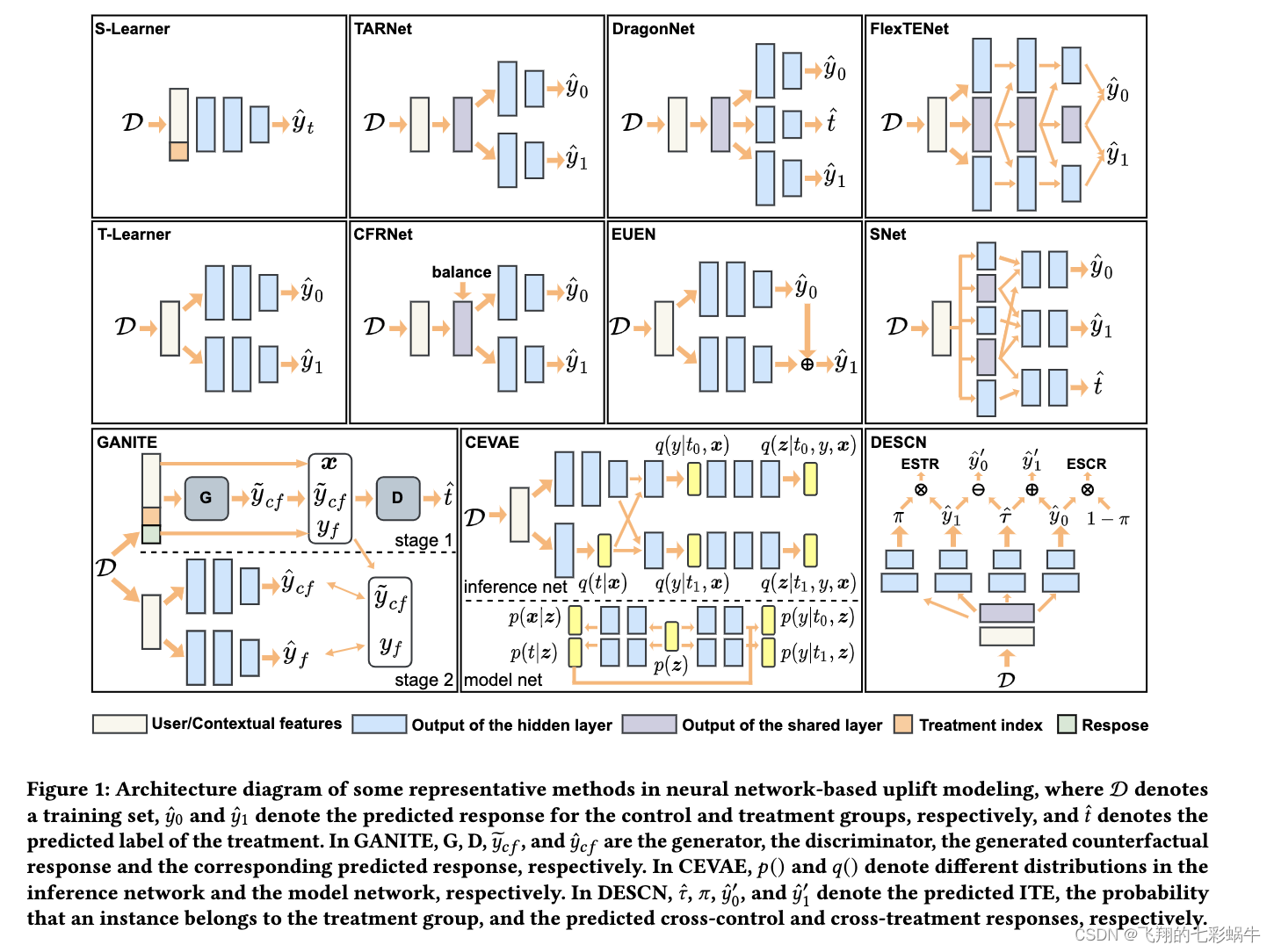 现有的提升建模方法主要根据设计思想包括三个研究方向:1)基于元学习器。这条线的基本思想是使用现有的预测方法为用户响应构建估计器,可以是全局的(即S-Learner),也可以是处理组和对照组(即T-Learner)[17]。在此基础上,通过引入各种附加操作,如XLearner[17]、R-Learner[24]和DR-Learner[4]等,设计了不同的两步学习器。2)基于树的。这条线的基本思想是使用树结构将整个用户种群逐渐划分为对每个处理敏感的子种群。关键步骤是利用不同的分裂准则直接建模抬升,如基于各种分布散度[25]和预期响应[29,38]。此外,通过整合多棵树获得的因果森林[3]是这条线的另一种代表性方法,已经提出了几种变体[1,32]。3)基于神经网络的。这条线的基本思想是利用神经网络为用户的响应设计更复杂和灵活的估计器[16,21,35,39],其中大部分可以看作是T-learner的改进[8,9,30,31]。在本文中,我们专注于基于神经网络的线,因为它可以更好地适应由于神经网络的灵活性而引入的特征交互建模的目标。此外,由于商业系统中通常使用各种神经网络模型,因此对这条线的研究可以更容易地与其他线集成。我们在图 1 中展示了一些代表性方法在基于神经网络的抬升建模中的架构。