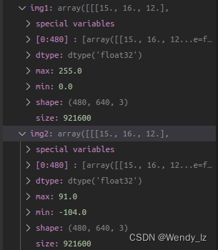 由于 img 是 uint8, 范围为(0-255), img1 -112 时本应该出现负值,但都被 clip 至了[0, 255], 所以问题就出在数据范围上,下图为两种方式 debug 得到的不同结果。所以解决办法就是得先将数据转为 float32, 再做减法,结果正常 !!!