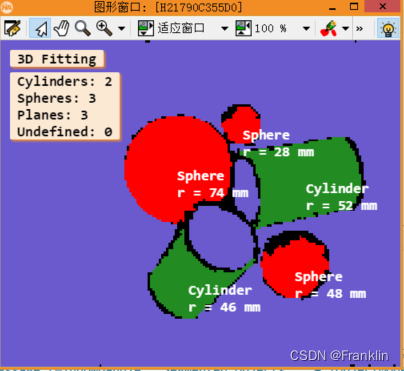 在这个例子里面展示了用HALCON的操作函数segment_object_model_3d,来把一个输入的2.5D的3D图像进行分割。这里因为图像是一组圆柱体,有运用了一个物体的判别操作函数:dev_display_fitting_results。然后,自动给出了region的划分。