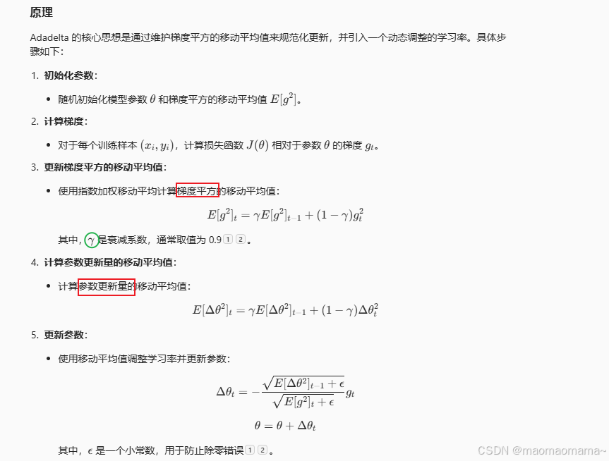 Adadelta 是一种自适应学习率优化算法,由 Matthew D. Zeiler 于 2012 年提出。它是对 Adagrad 的改进,旨在解决 Adagrad 学习率逐渐变小的问题。Adadelta 通过限制累积梯度的窗口大小,动态调整每个参数的学习率,从而提高训练效率和稳定性。