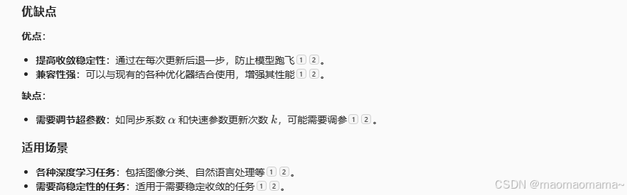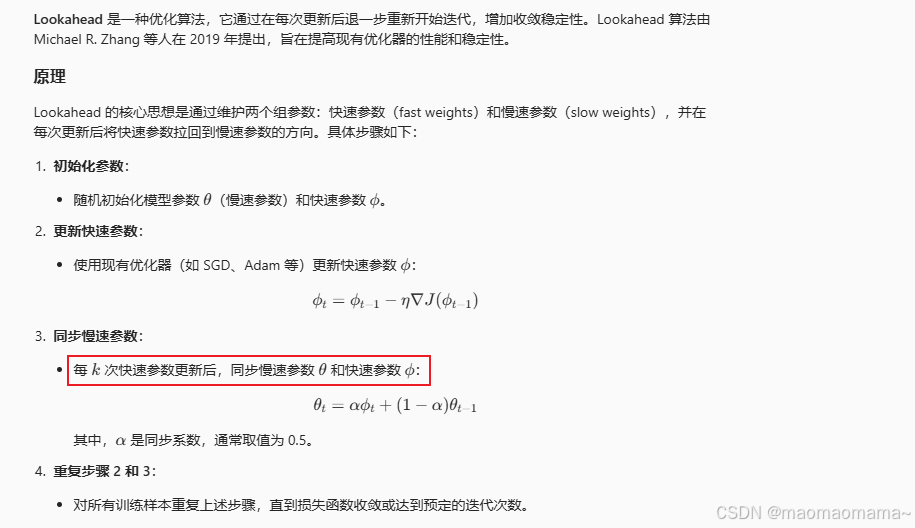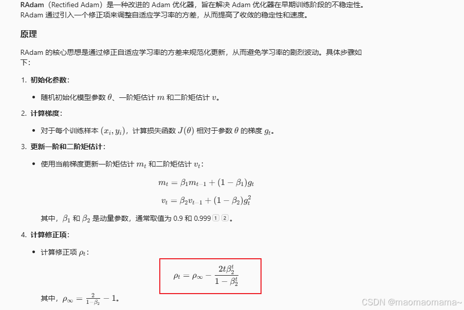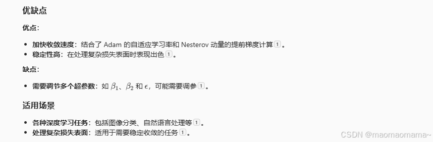 它是对 Adagrad 的改进,旨在解决 Adagrad 学习率逐渐变小的问题。Adadelta 通过限制累积梯度的窗口大小,动态调整每个参数的学习率,从而提高训练效率和稳定性。它通过计算梯度的一阶和二阶矩估计来动态调整每个参数的学习率,并包含偏差校正步骤,以确保在训练初期估计值的准确性。Nadam 的核心思想是结合 Adam 的自适应学习率和 Nesterov 动量的提前梯度计算。两个超参数:学