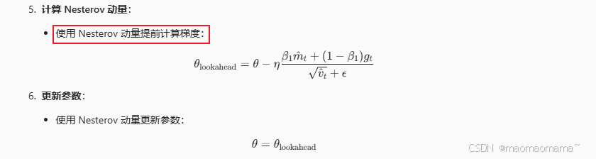 Nadam 的核心思想是结合 Adam 的自适应学习率和 Nesterov 动量的提前梯度计算