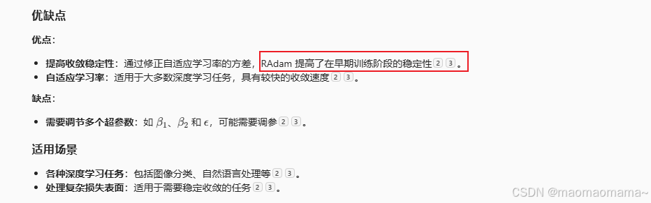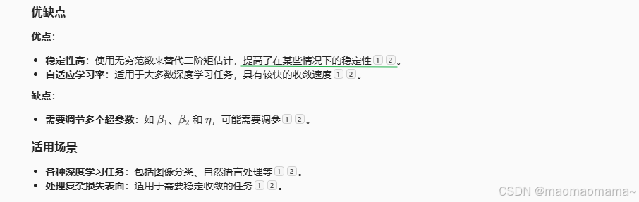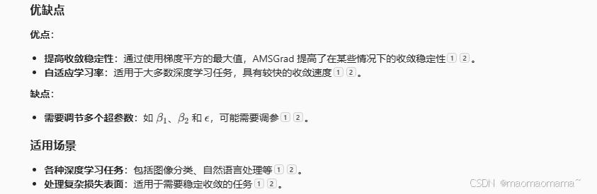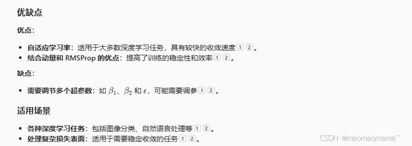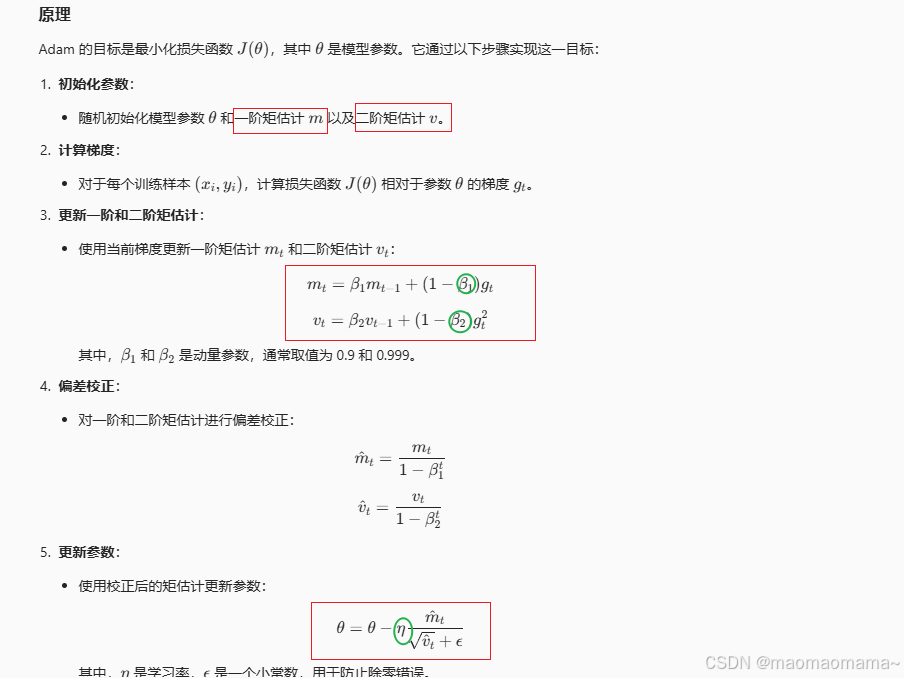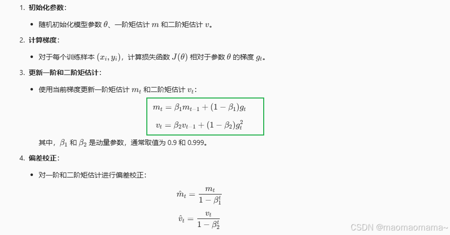 Adam(Adaptive Moment Estimation)是一种自适应学习率优化算法,结合了动量和 RMSProp 的优点。它通过计算梯度的一阶和二阶矩估计来动态调整每个参数的学习率,并包含偏差校正步骤,以确保在训练初期估计值的准确性。