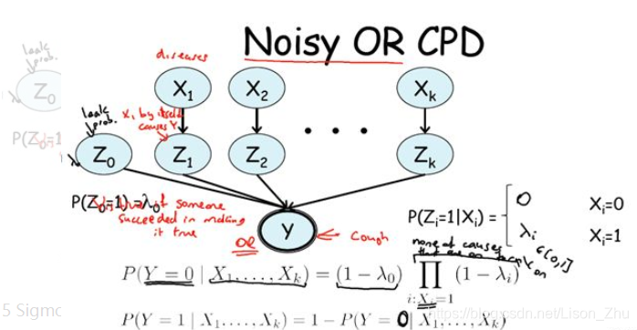 Noisy OR (NOR)model如下图所示,Y结点有父亲结点Z1到Zk,OR关系的意思即只有Z1到Zk全部不发生,那么才有Y=0,而Zi是否发生受到随机变量Xi的影响,如果把最后Y看成教授的推荐信,那么X1到Xk可以看做学生的某项表现,学生第i项表现优异的情况下被教授欣赏的概率为λi,这个图的意思就是如果教授至少欣赏了学生的某一项优异表现,则有推荐信。那么Z0是什么呢?这个概率称为lea..
