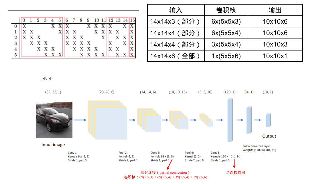 现代卷积核设计通常是“统一连接所有通道”,上述示例程序中也是如此。但实际的 LeNet-5 是例外:它并不遵循现代卷积核设计,而是刻意地使用部分连接(partial connection),降低参数量。