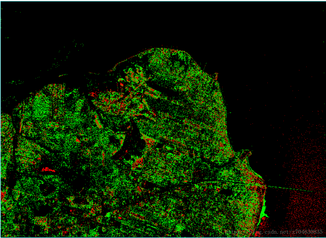 实验结果中, 绿色表示添加的元素,红色表示减少的元素。示例中采用的差值算法的处理结果虽然不够完美,但也能提供一种变化检测的处理思路。最终的实验结果为: