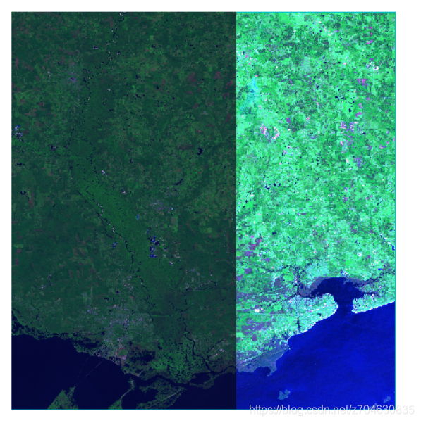 用ENVI打开原始数据,左边为变化前的全色影像,右边为变化后的假彩色影像,在ENVI Classic中将两幅图像进行link,从下图可以很直观的看到,大桥非常明显的被飓风毁坏: