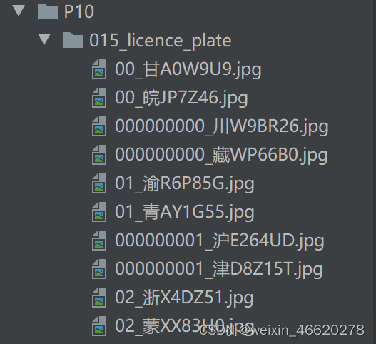 这里的车牌图片的数据文件如右图所示,没有进行分类的,所以通过获取各个图片文件名作作为一类的名称