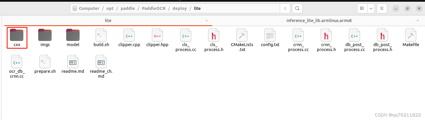 1.将Paddle-Lite编译好的cxx文件夹放置到PaddleOCR/deploy/lite目录下。3.除了拷贝过来的源代码,还需要clipper.h 和clipper.cpp这两个文件,在。2.将编译好的opencv文件夹放置到cxx目录下。