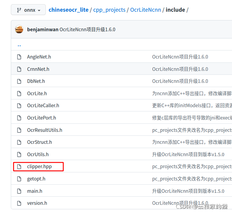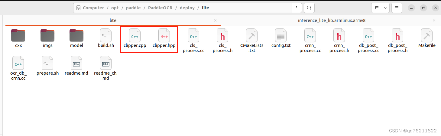 3.除了拷贝过来的源代码,还需要clipper.h 和clipper.cpp这两个文件,在chineseocr_lite (GitHub - DayBreak-u/chineseocr_lite: 超轻量级中文ocr,支持竖排文字识别, 支持ncnn、mnn、tnn推理 ( dbnet(1.8M) + crnn(2.5M) + anglenet(378KB)) 总模型仅4.7M)中拷贝过来,放置在PaddleOCR/deploy/lite目录下