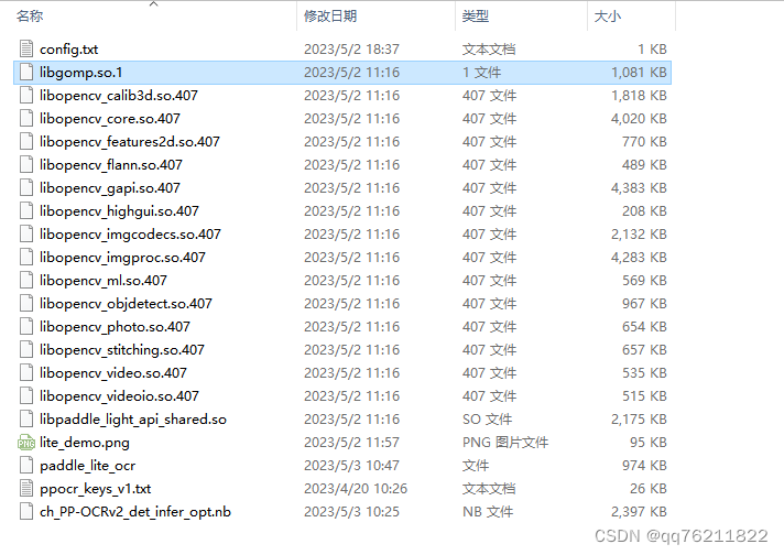 将libpaddle_light_api_shared.so、ch_PP-OCRv2_det_infer_opt.nb、paddle_lite_ocr、libgomp.so.1、opencv等库放进同一个目录。如图: