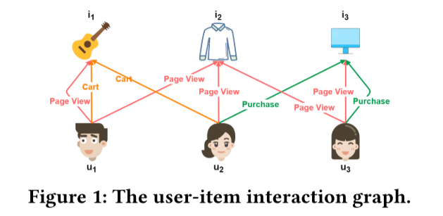 一类将多种行为交互分解成单独的子图来进行嵌入学习,虽然能通过整合辅助行为的洞察来丰富目标行为的表示,但它们无法有效探索节点间不同行为的交互,编码用户的复杂行为模式,如下图所示。用户𝑢1查看页面𝑖2,然后是另一个用户𝑢2查看同一页面,然后随后购买项目𝑖3。 此序列“ pageview后面进行pageview,然后进行购买”𝑢1和𝑖3之间的序列是一种细微的行为模式