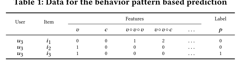如上图所示,下表中显示了用户𝑢3和项目𝑖1,𝑖2和𝑖3之间的行为模式预测任务的数据: