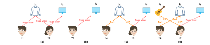 通过购物车动作增强了兴趣相似性(c):𝑢4和𝑢5在其购物车中添加项目𝑖4的动作比单纯的页面视图更强的兴趣相似性,如(a)所示。 因此,当𝑢5查看另一个项目𝑖5时,它也强烈暗示了𝑖4的可能购买意图。