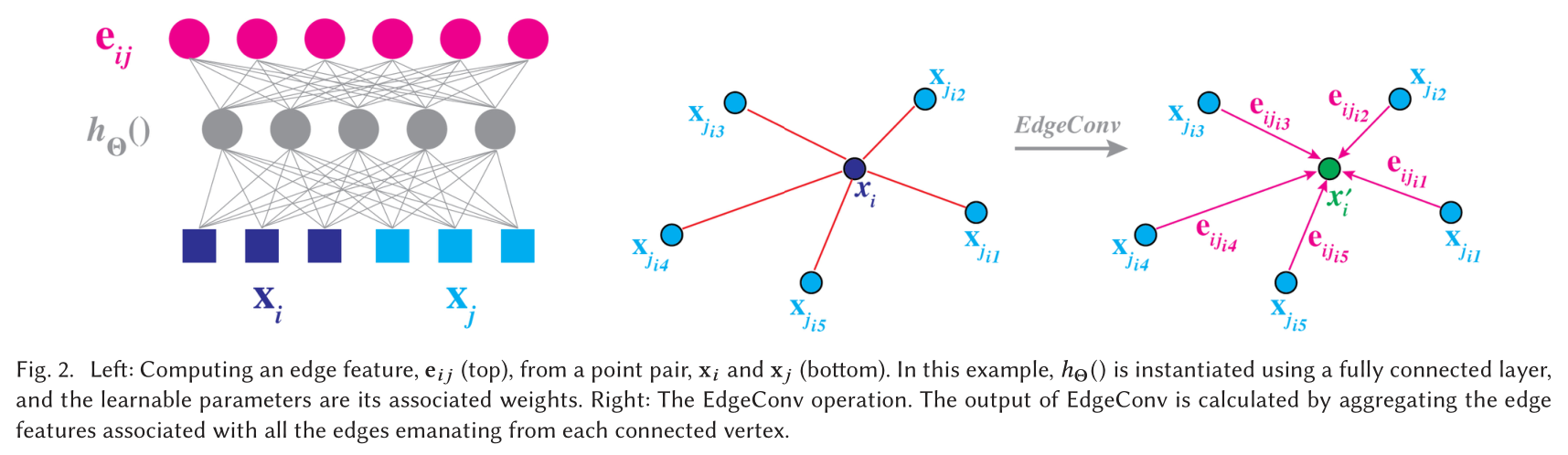 其中 x i \mathbf{x}_{i} xi是central point, { x j : ( i , j ) ∈ E } \left\{\mathbf{x}_{j}:(i, j) \in \mathcal{E}\right\} {xj:(i,j)∈E}是 x i \mathbf{x}_{i} xi的neigboured points。总而言之,给定带有 n n n个点的 F F F维点云,EdgeConv会产生一个相同数量点的 F ′ F^{\prime} F′维点云。