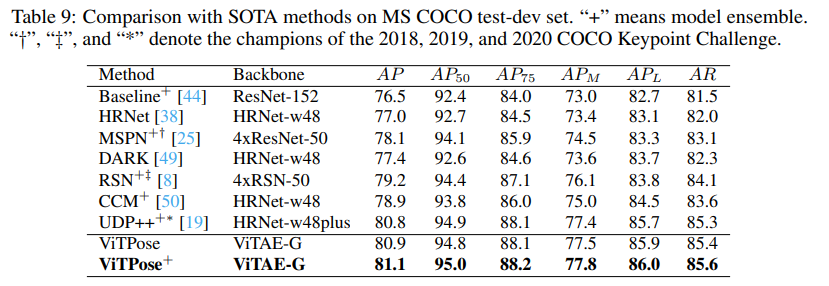 然后,我们建立了一个更强的模型ViTPose-G,即使用ViTAE-G[52]主干,该主干具有1B参数、更大的输入分辨率(576×432)以及用于训练的MS COCO和AI Challenger数据,以进一步探索ViTPose的性能极限。Bigdet[7]的一个更强大的检测器也用于提供人物检测结果(COCO数据集的68.5 AP on person class)。如表9所示,在MS COCO测试开发集上,具有ViTAE-Gbackbone的单个ViTPose模型的性能优于所有先前的SOTA方法,为80.9 AP,其中先前的最佳方法UDP++集成了17个模型,并达到80.8 AP,检测器略好(在COCO数据集的人类上为68.6 AP)。在整合了三个模型后,ViTPose进一步获得了最佳的81.1 AP。