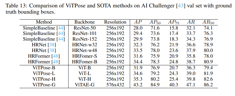 AI Challenger val set。同样,我们评估了ViTPose在具有相应解码器头的AI Challenger val集上的性能。如表13所示,与具有代表性的基于CNN和基于transformer的模型相比,我们的ViTPose获得了更好的性能,即来自ViTPose-H的35.3 AP vs.来自HRNet-w48的33.5 AP和来自HRFromer的34.4 AP。ViTPose-G通过更强的ViTAE-G主干和更大的输入分辨率在数据集上实现了最好的43.2 AP。然而,人工智能挑战者的精度仍然不够高,这表明