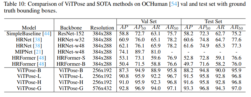 OCHuman val和测试集。为了评估人体姿态估计模型在严重遮挡的人体实例上的性能,我们在具有地面实况边界框的OCHuman val和测试集上测试了ViTPose变体和代表性模型。我们不收养多余的人检测器,因为并非所有的人类实例都在OCHuman数据集中进行了注释,其中人类检测器将导致许多“假阳性”边界框,并且不能反映姿态估计模型的真实能力。具体来说,与MS COCO对应的ViTPose的解码器头使用数据集,因为MS COCO和OCHuman数据集中的关键点定义相同。结果见表10。与以前具有复杂结构的最先进(SOTA)方法(如MIPNet[21])相比,ViTPose在OCHuman val上获得了超过10个AP的增加集合,尽管在网络结构中没有专门的设计来处理遮挡,这意味着ViTPose具有强大的特征表示能力。还应注意的是,HRFormer[48]从MS COCO到OCHuman的性能大幅下降,并且小模型优于基本模型,即在OCHuman val集上,53.1 AP vs.s 50.4 AP。这些现象表明,HRFormer可能过度拟合MS COCO数据集,尤其是对于更大规模的模型,并且需要额外的微调阶段才能从MS COCO转移到OCHuman。此外,ViTPose显著推动了val和测试集上关键点检测性能的前沿,即获得约图93。这些结果表明,ViTPose可以灵活地处理具有严重闭塞的挑战性病例,并获得SOTA性能。