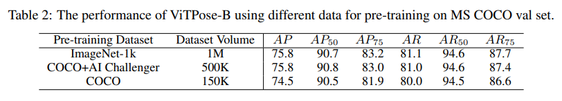 模型分别在三个数据集上预训练1600个时期,然后在MS COCO数据集上微调210个时期的姿态标注。结果汇总在表2中。可以看出,结合MS COCO和AI Challenger数据进行预训练,与使用ImageNet-1k相比,ViTPose获得了相当的性能。应该注意的是,数据集的体积仅为ImageNet-1k的一半。这意味着对来自下游任务的数据进行预训练具有更好的数据效率,验证了ViTPose在使用预训练数据方面的灵活性。然而,如果仅使用MS COCO数据进行预训练,则AP降低1.3。这可能是由于MS COCO数据集的数量有限造成的,即MS COCO中的实例数量是MS COCO和AI Challenger组合的三分之一。