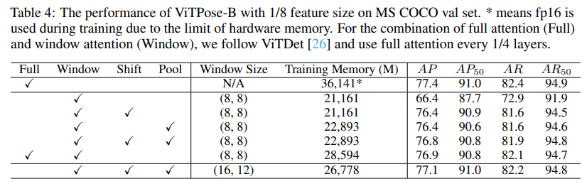 注意力类型的影响。如HRNet[38]和HRFormer[48]所示,高分辨率特征图有利于姿态估计任务。通过改变修补嵌入层的下采样率,即从1/16到1/8,ViTPose可以容易地生成高分辨率特征。此外,为了缓解由转换层的二次计算复杂性引起的内存不足问题,可以使用具有移位和池机制的窗口注意,如第3.3节所述。结果如表4所示“Shift”和“Pool”表示轮班窗口 以及池化窗口机制。即使在混合精度训练模式下,直接使用1/8特征大小的全注意力也能在MS COCO val集上获得最好的77.4 AP,同时承受较大的内存占用。窗口关注可以缓解内存问题,同时 以由于缺乏全局上下文建模而导致的性能下降为代价,例如从77.4 AP下降到66.4 AP。移位窗口和池化窗口机制都促进了全局上下文建模的跨窗口信息交换,从而显著提高了10个AP的性能内存增加不到10%。当同时应用这两种机制时,即第5行,性能进一步提高到76.8 AP,这与ViTDet[26]中提出的策略相当,该策略联合使用全注意力和窗口注意力(第6行),但内存要低得多占地面积,即76.8 AP vs.76.9 AP和22.9G内存vs.28.6G内存。比较表4中的第5行和最后一行,我们还注意到,通过将窗口大小从8×8扩大到16×12,可以将性能从76.8 AP进一步提高到77.1 AP,这也优于联合满窗和窗口注意力设置