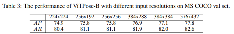 输入分辨率的影响。为了评估ViTPose是否能很好地适应不同的输入分辨率,我们用不同的输入图像大小训练ViTPose,并在表3中给出结果。ViTPose-B的性能随着输入分辨率的提高而提高。还需要注意的是,平方输入虽然具有更大的分辨率,例如256×256 vs.s.256×192,但并没有带来太多的性能增益。原因可能是MS COCO中人类实例的平均纵横比为4:3,并且平方输入大小与统计数据不太吻合。