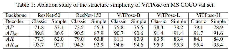 结构简单,可扩展。我们分别使用第3.1节中描述的经典解码器和简单解码器来训练ViTPose。我们还使用两个解码器作为参考,使用ResNet[17]作为backbone来训练SimpleBaseline[44]。表1显示了结果。可以观察到使用简单解码器可以导致ResNet-50和ResNet-152的大约18个AP下降。然而,具有ViT Transformer作为主干的ViTPose与简单解码器一起工作得很好,对于ViT-B、ViT-L和ViT-H只有边际性能下降(即,小于0.3个AP)。对于度量AP50和AR50,ViTPose在使用两个解码器中的任何一个时都获得了类似的性能,这表明普通ViT Transformer具有很强的表示能力,并且不需要复杂的解码器。从表中还可以得出结论,ViTPose的性能有所提高随着模型大小的不断增加,ViTPose具有良好的可扩展性。