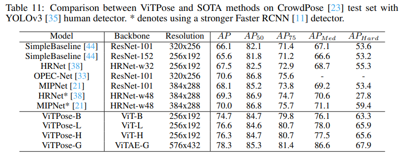 CrowdPose test set。为了在CrowdPose[23]数据集上评估ViTPose,我们使用了CrowdPose数据集对应的ViTPose的解码器头和CrowdPoses提供的人体检测结果。如表11所示,ViTPose在CrowdPose上设置了新的最先进技术,即分辨率为256x192的76.6 AP,这优于以前具有更高分辨率和更好检测器的方法,例如MIPNet的70.0。通过具有ViTAE-G[52]backbone和576x432输入分辨率的ViTPose-G,性能可以进一步提高到78.3 AP。结果表明,ViTPose可以很好地适应具有遮挡、截断和外观变体的人群场景