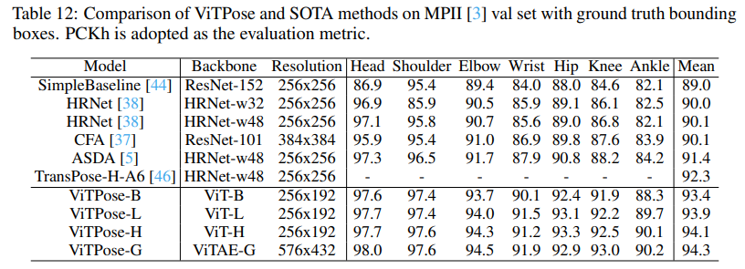 我们评估了ViTPose和具有代表性的模型在具有基本事实边界框的MPII val集上的性能。根据MPII的默认设置,我们使用PCKh作为性能评估的指标。如表12所示,ViTPose变体在单次联合评估和平均评估中都获得了更好的性能,例如,ViTPose-B、ViTPose-L和ViTPose-H在较小的输入分辨率(256x192 vs.s.256x256)下实现了93.4、93.9和94.1的平均PCKh。使用更大的输入分辨率和更大的主干,例如,具有ViTAE-g主干和576x432输入分辨率的ViTPose-g,性能进一步提高到94.3 PCKh,在MPII val集上设置了新的SOTA。