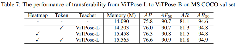 可转让性分析。为了评估ViTPose的可转移性,我们使用经典的输出蒸馏和所提出的知识令牌蒸馏来将知识从ViTPose-L转移到ViTPose-B。结果见表7。可以看出,基于令牌的蒸馏为具有边际额外内存占用的ViTPose-B带来了0.2个AP增益,而输出蒸馏带来了0.5个AP增益。这两种蒸馏方法是互补的,将它们结合使用可获得76.6的AP,验证了ViTPose模型的优异可转移性。
