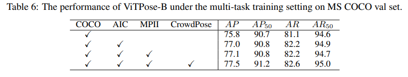 以及用于多任务训练的CrowdPose[23]数据集。MS COCO值集的结果列于表6中。补充资料中提供了其他数据集的结果。请注意,我们直接使用多任务训练后的模型进行评估,而无需在MS COCO上对其进行进一步微调。可以观察到,通过使用所有四个数据集进行训练,ViTPose的性能从75.8 AP持续增加到77.5 AP。尽管与MS COCO和AI Challenger的组合(40K vs.s.500K)相比,MPII的体积要小得多,但使用MPII进行训练仍能带来0.1的AP增长,这表明ViTPose可以很好地利用不同数据集中的不同数据。