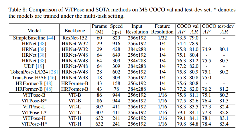 尽管ViTPose的模型尺寸很大,但它在吞吐量和准确性之间取得了更好的平衡,这表明普通ViT Transformer具有很强的表示能力,并且对现代硬件很友好。此外,ViTPose在更大的主链上表现良好。例如,ViTPose-L获得了比ViTPose-B好得多的性能,即在val和测试开发集上分别为78.3 AP和77.3 AP。ViTPose-L以类似的推理速度优于之前的SOTA CNN和transformer模型,包括UPD和TokenPose。可以得出类似的结论