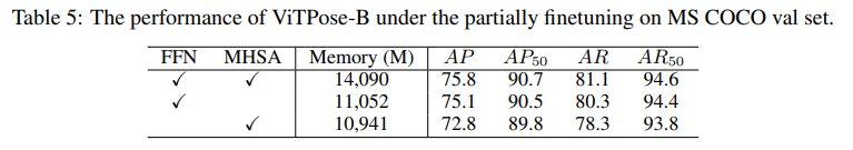 微调灵活性。如NLP领域[31,2]所示,预训练的Transformer模型可以很好地推广到具有部分参数调整的其他任务。为了研究它是否仍然适用于ViT Transformer,我们分别在所有参数未冻结、MHSA模块冻结和FFN模块冻结的情况下,在MS COCO上微调ViTPose。我们根据经验证明,在MHSA模块冻结的情况下,ViTPose获得了与完全微调设置相当的性能