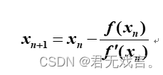 accuracy = 0.0001#精确度 x0 = 2 N = 100 k = 1 x_data = []#列表记录 y_data = [] x1 = f(x0) # 记录初始节点 x_data.append(0) y_data.append(x1) while k < N: error = abs(x1 - x0) x_data.append(k) y_data.append(x1) if (error < accuracy): break k += 1 x0 =x1 x1 = f(x0) if k >= N: print('错误') else: print("\n迭代过程") for x in x_data: print("X{}={}".format(x, y_data[x])) print("次数=", k) print("方程解=", x1) print("误差=",error) 牛顿迭代格式: 算法分析